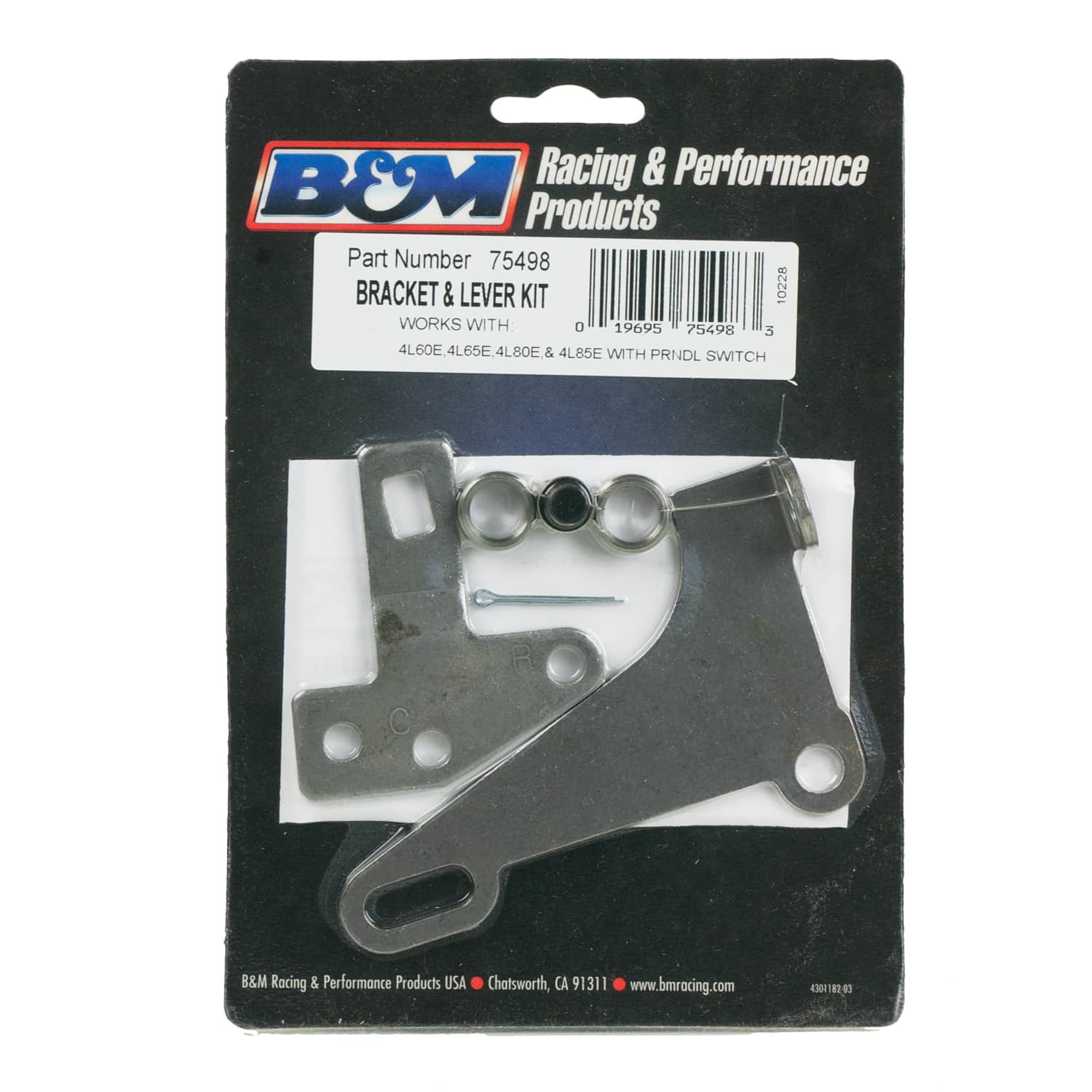 B&M Cable Bracket and Shift Lever Kit for GM 4L60E, 4L65E, 4L70E, 4L75E, 4L80E, and 4L85E automatic transmissions with a PRNDL switch. Note: For Forward Exit Cable shifters Only, with the shift lever oriented at the factory 6 o’clock position pulling the cable rearward. Will Not work on Rear Exit Cable shifters (Bandit and Pro Gate Shifters) with the shift lever flipped up at the 12 o’clock position pulling the cable forward.