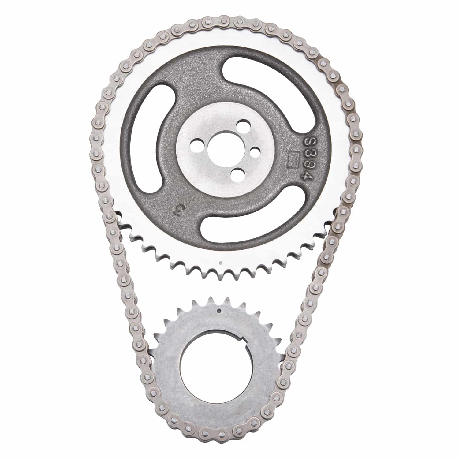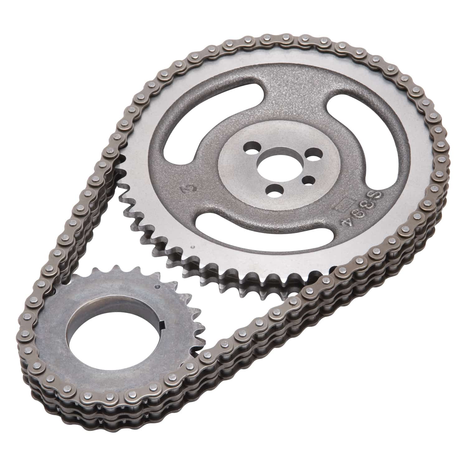 Edelbrock part #7809 Performer-Link timing chain is for use with Edelbrock or stock cams. They have a solid-bushing chain for a true bearing surface that rolls with the sprockets, eliminating chain stretch
