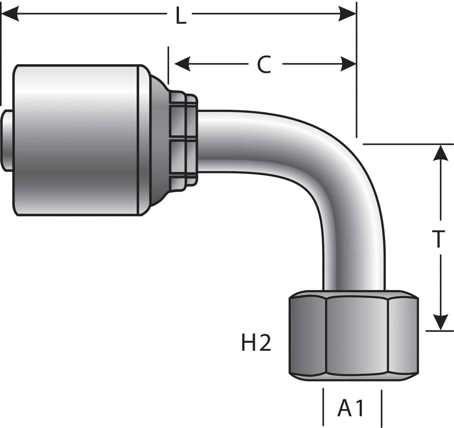Coupling Description MegaCrimp Female DIN 24 Cone Swivel – Heavy Series w/ O-Ring – 90 Bent Tube