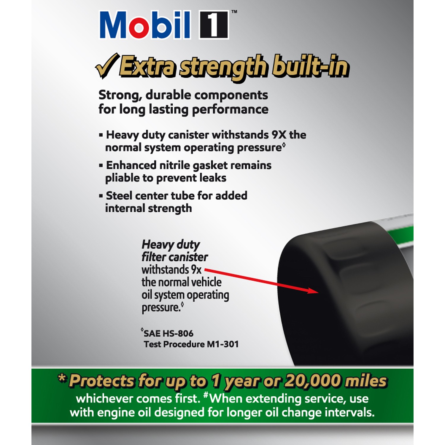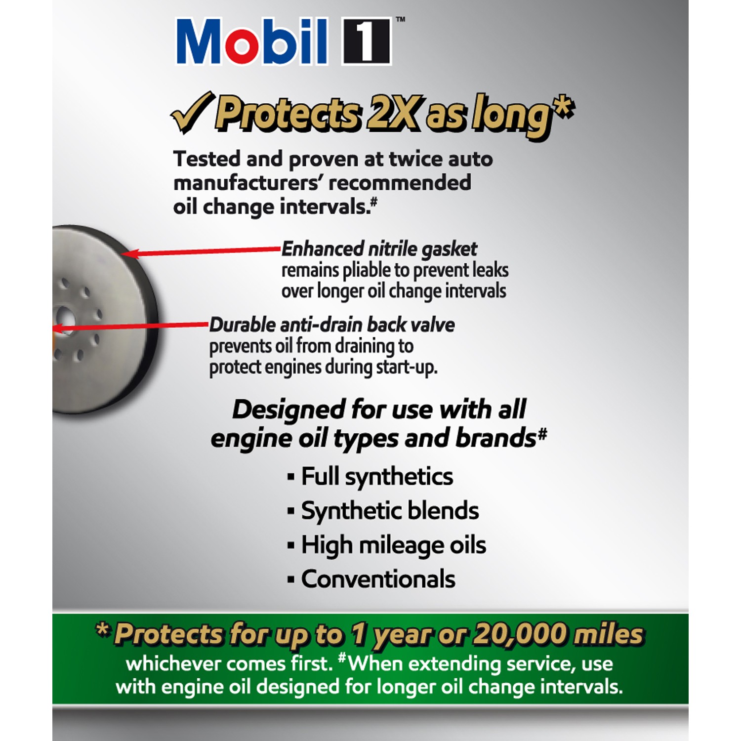 Mobil 1 Extended Performance Oil Filters are built with strong, durable components and are tested and proven to protect 2X as long as auto manufacturersв„ў recommended oil change intervals. A high-efficiency synthetic blend media removes over 99% of harmful contaminants keeping oil cleaner, longer. Enhanced nitrile gasket remains pliable to help prevent oil leaks while a durable anti-drain back valve protects against dry starts. Durable, heavy-duty filter canister withstands 9X the normal vehicle oil system operating pressure. These are just some of the advanced technologies that go into making an oil filter that can provide proven protection for up to one full year or 20,000 miles. Meets requirements of the Mobil 1 annual protection limited warranty.