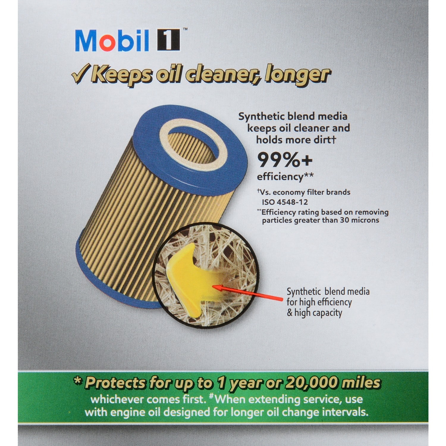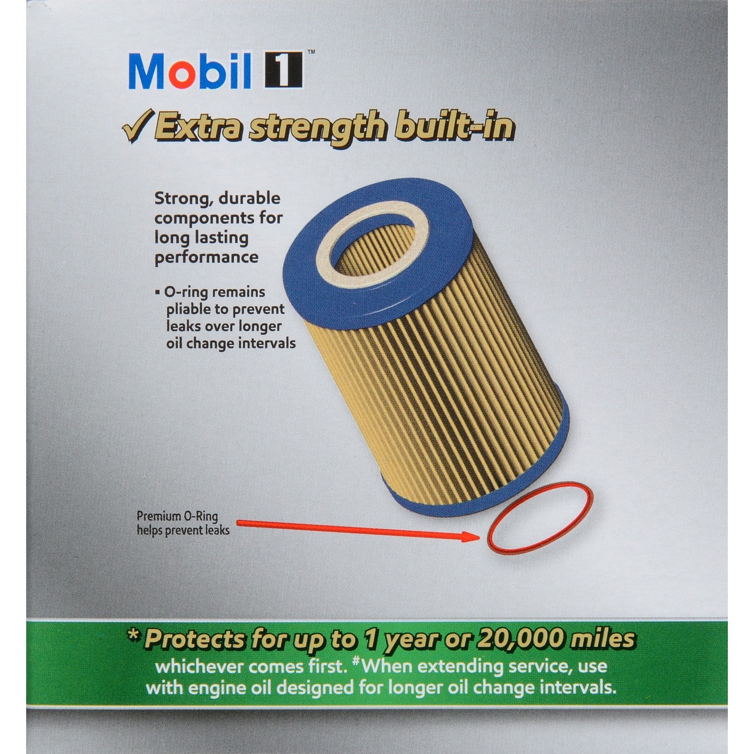 Mobil 1 Extended Performance Oil Filters are built with strong, durable components and are tested and proven to protect 2X as long as auto manufacturers?„? recommended oil change intervals. A high-efficiency synthetic blend media removes over 99% of harmful contaminants keeping oil cleaner, longer. Enhanced nitrile gasket remains pliable to help prevent oil leaks while a durable anti-drain back valve protects against dry starts. Durable, heavy-duty filter canister withstands 9X the normal vehicle oil system operating pressure. These are just some of the advanced technologies that go into making an oil filter that can provide proven protection for up to one full year or 20,000 miles. Meets requirements of the Mobil 1 annual protection limited warranty.