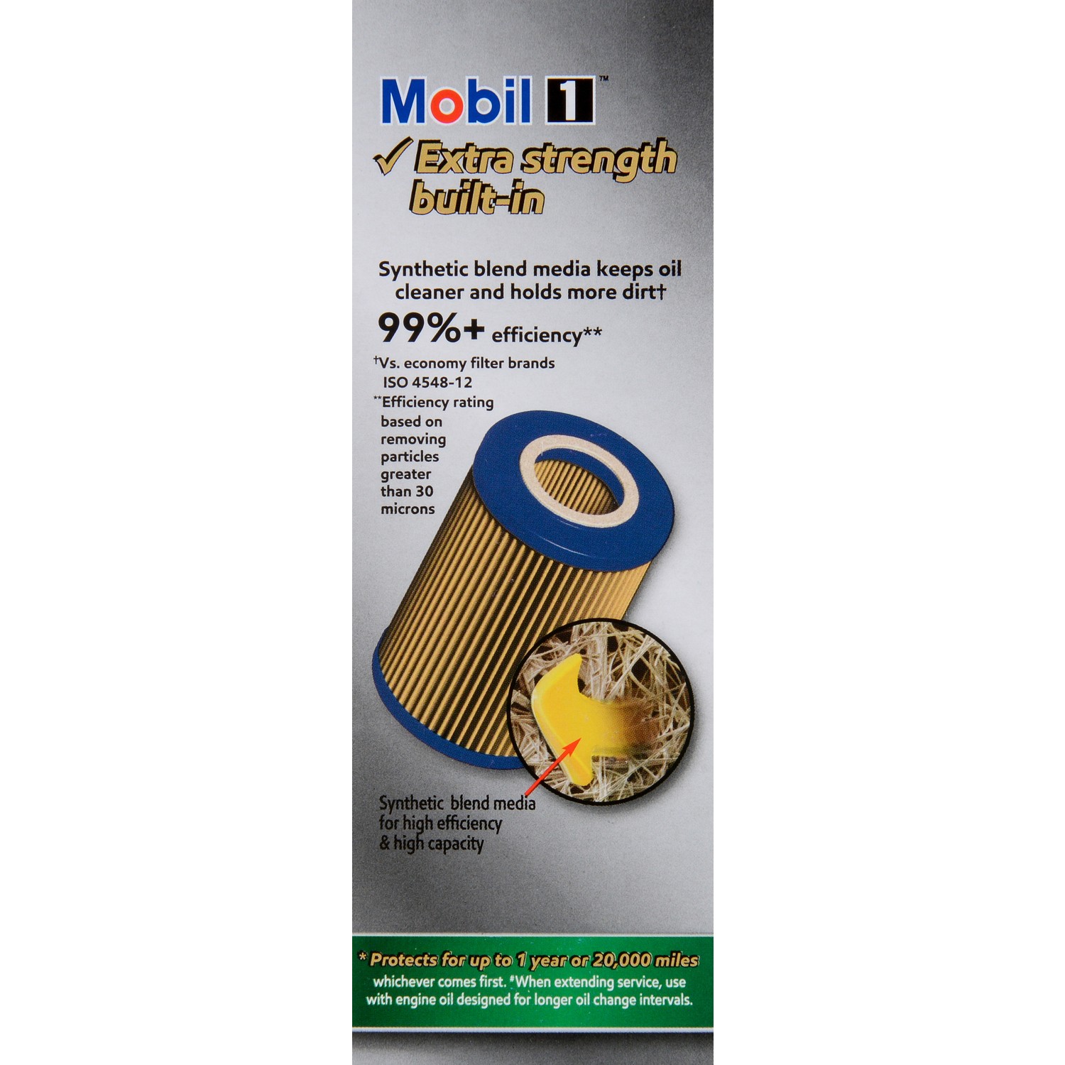 Mobil 1 Extended Performance Oil Filters are built with strong, durable components and are tested and proven to protect 2X as long as auto manufacturersв„ў recommended oil change intervals. A high-efficiency synthetic blend media removes over 99% of harmful contaminants keeping oil cleaner, longer. Enhanced nitrile gasket remains pliable to help prevent oil leaks while a durable anti-drain back valve protects against dry starts. Durable, heavy-duty filter canister withstands 9X the normal vehicle oil system operating pressure. These are just some of the advanced technologies that go into making an oil filter that can provide proven protection for up to one full year or 20,000 miles. Meets requirements of the Mobil 1 annual protection limited warranty.