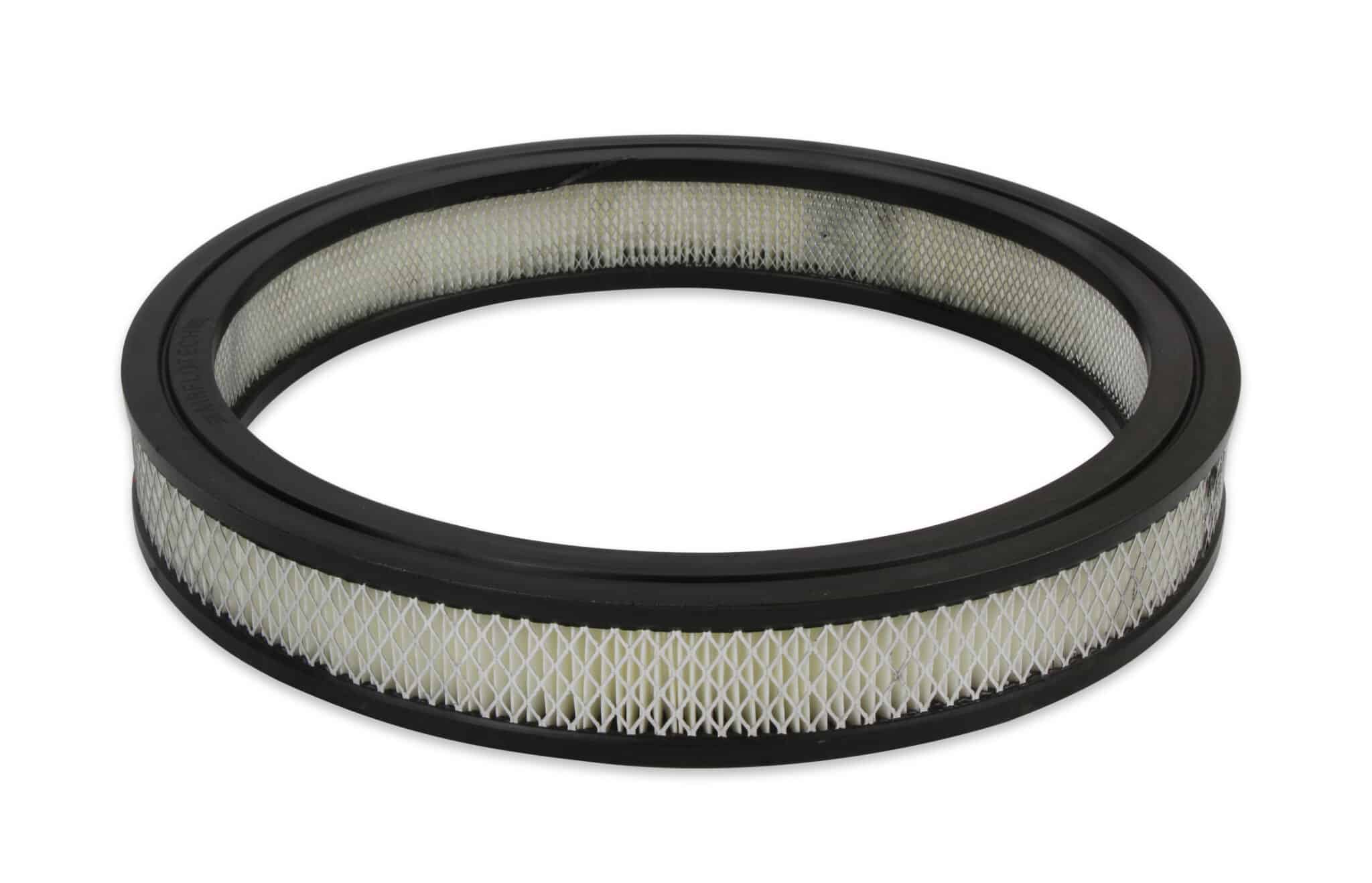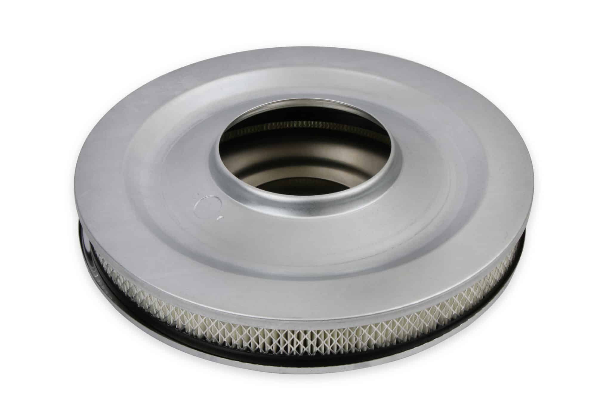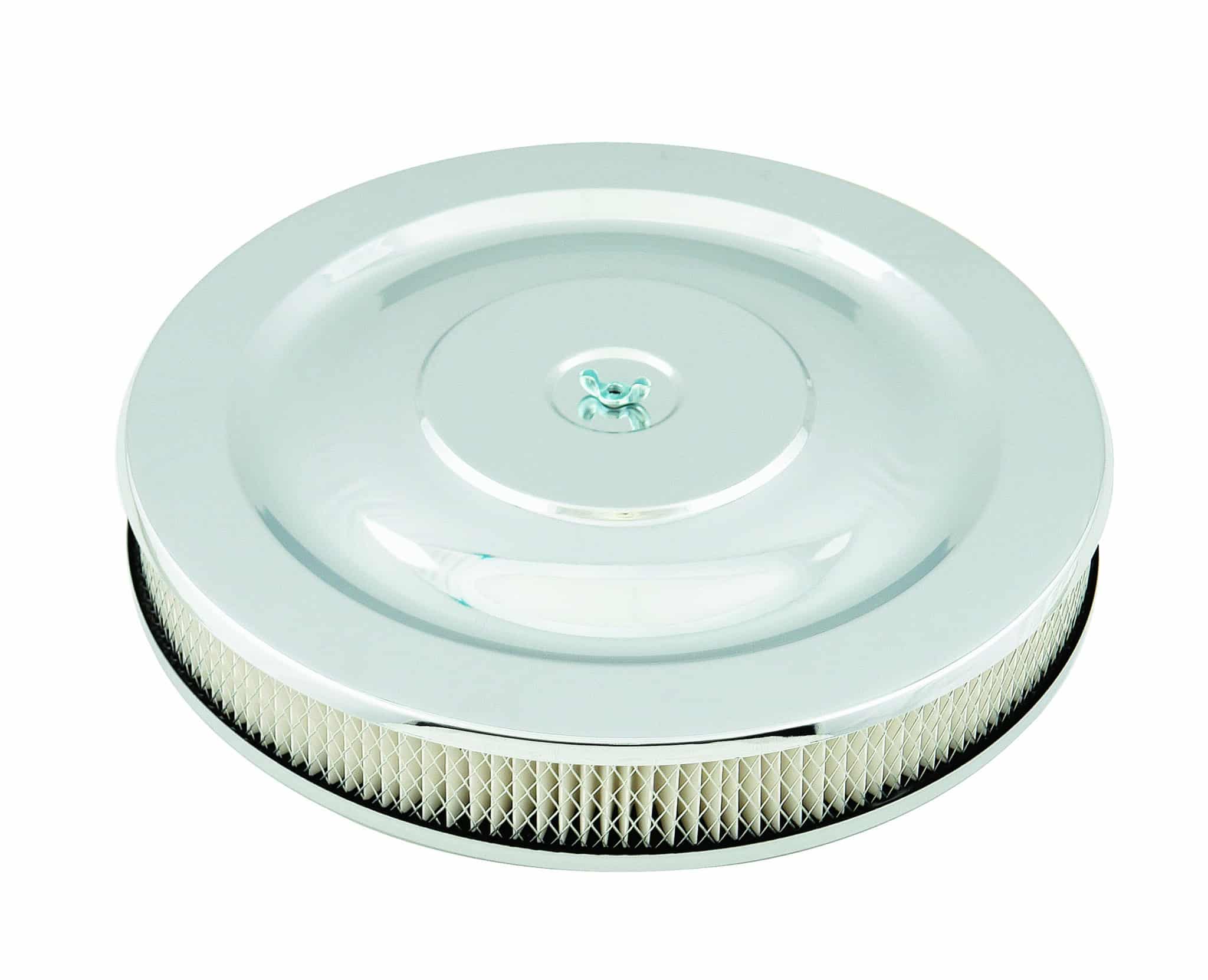 This Mr. Gasket Air Cleaner has chrome plated steel top and base. Fits most carburetors with a 5-1/8 inch neck. Has a 14 x 2 inch open paper filter element with wire mesh surround. Base has punch out for included pcv fitting. Carburetor stud and wing nut included. Overall height is 2-1/4 inch.