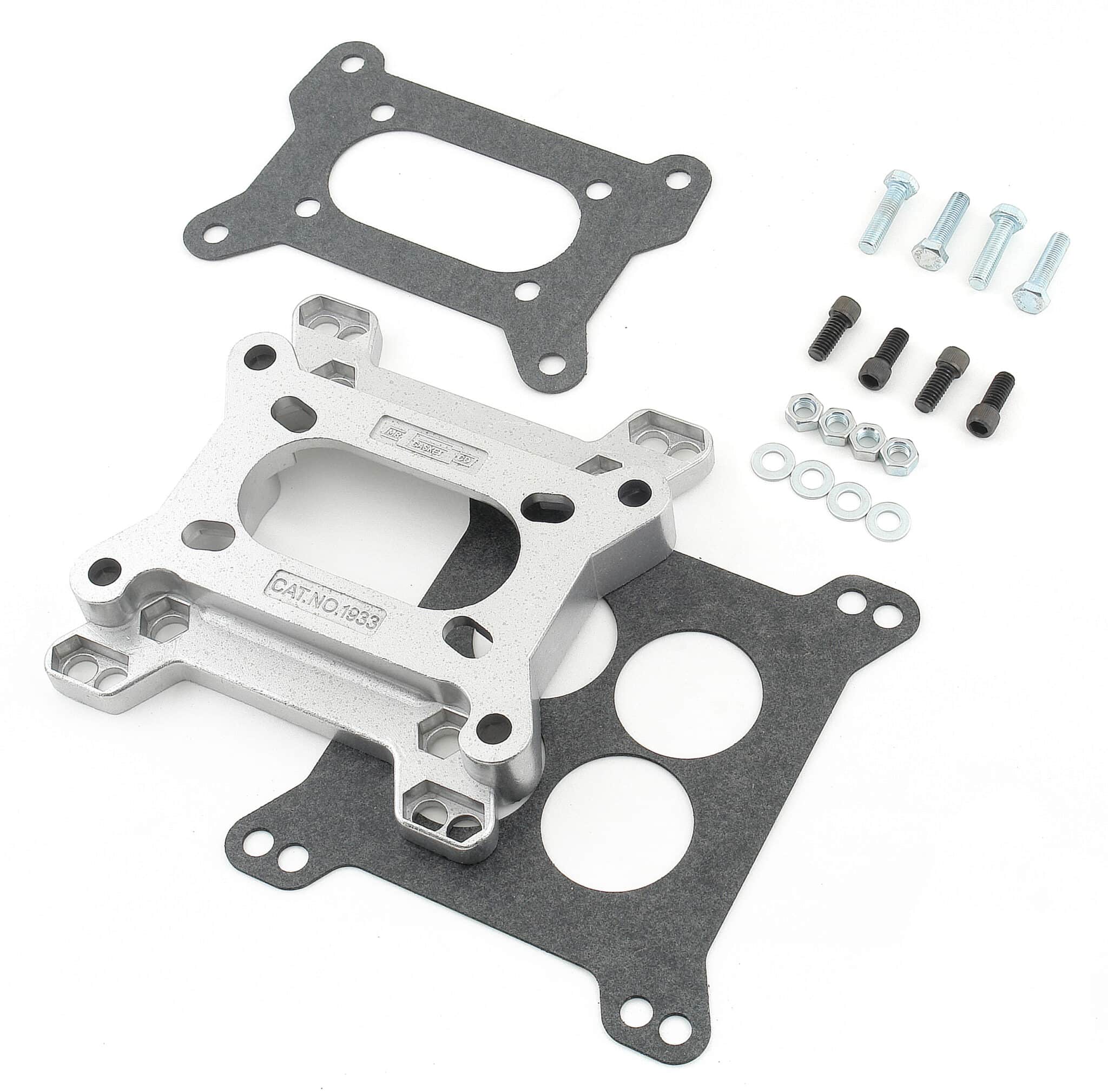 This Mr. Gasket Carburetor Adapter Kit adapter 4-bolt, 4-barrel carburetors to 4-bolt, 2-barrel intake manifolds or 4-bolt, 2-barrel carburetors to 4-bolt, 4-barrel intake manifolds. It is die-cast aluminum, 1 inch thick with an open center. Installs simply between the intake manifold and the carb. Gaskets, bolts, nuts and washers included.