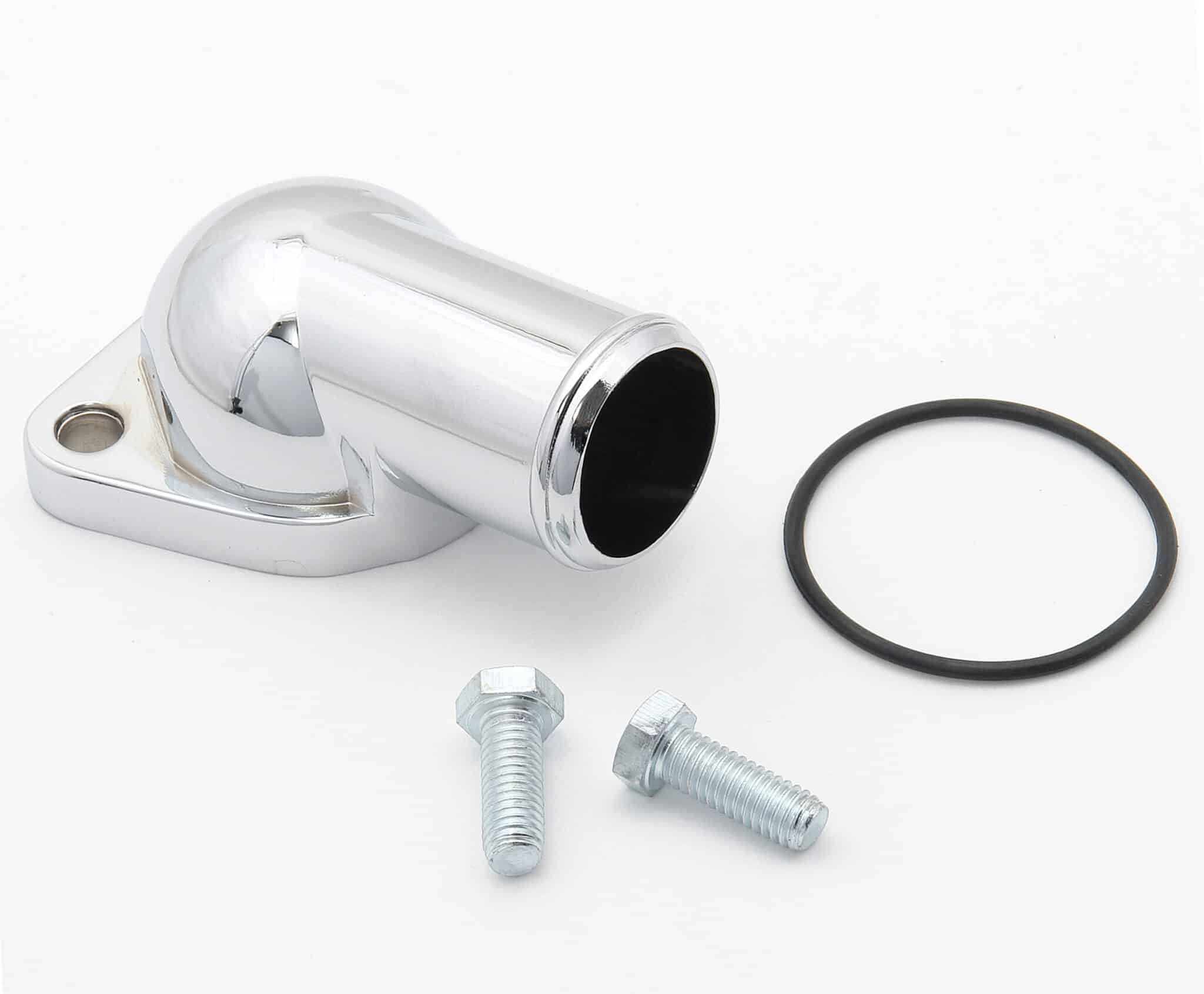Precision die-cast, these water necks or thermostat housings are first polished to a high luster, then chrome plated. Features an o-ring style seal to prevent water leaks. Comes with o-ring gasket and mounting bolts.