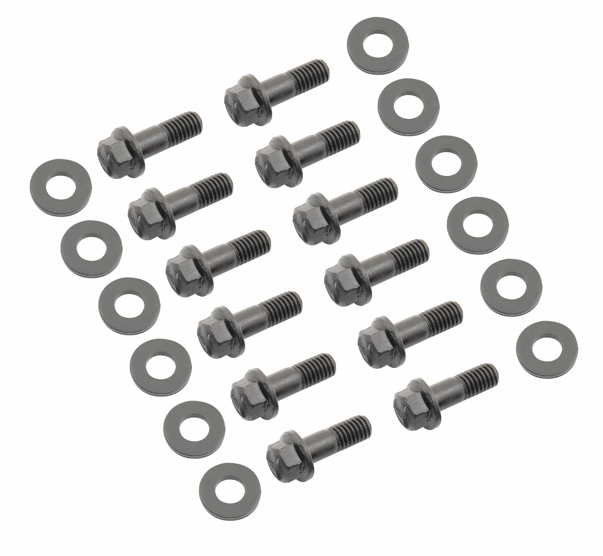 These Grade 5 hex head bolts are black coated plated for protection and appearance. Hardened flat washers provide uniform torque & prevent galling on aluminum manifolds.