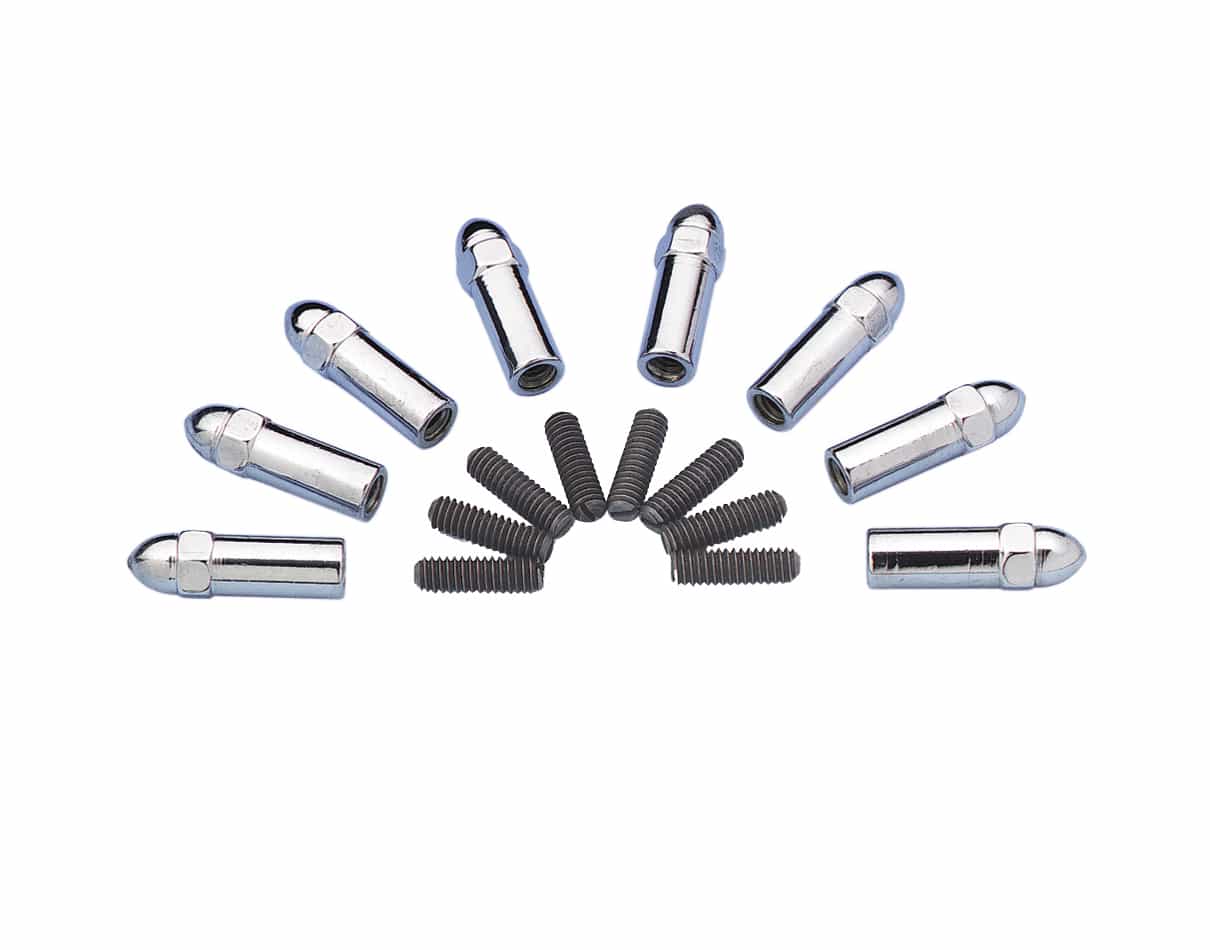 8 chrome plated grade 5 hex nut valve cover nuts with an acorn head work in conjunction with 8 studs to secure bolt perimeter bolt style valve covers on Chevrolet small block V8s. Works with both stamped steel and cast aluminum valve covers.