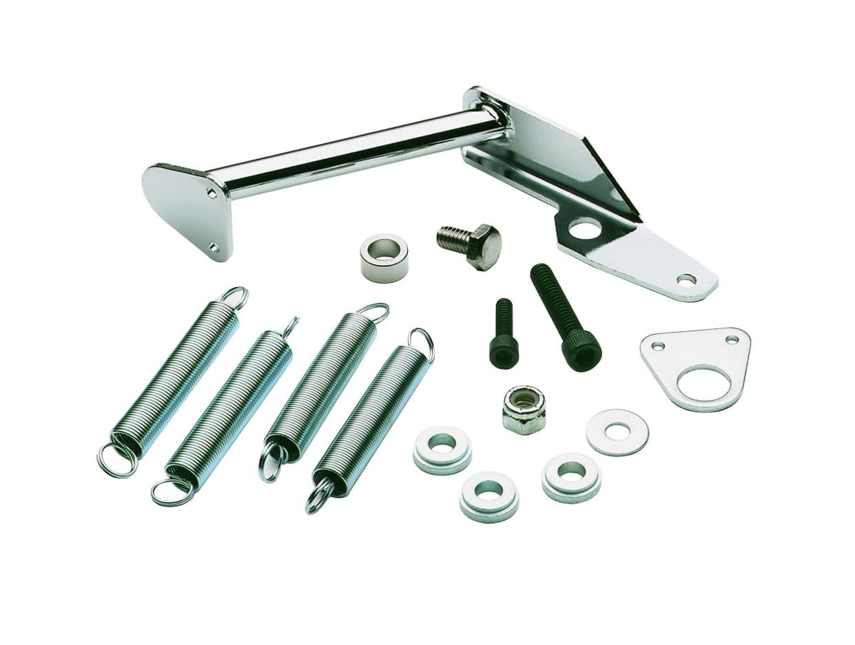 Mr. Gasket Throttle Return Spring Kit offers a convenient dress up solution when using a Holley 2300/2305 series 2-barrel or 4150/4160 series 4-barrel carburetors. This kit is complete with Chrome plated brackets for an upgraded look from factory and includes both heavy and light spring sets to offer maximum flexibility in matching springs to provide you that progressive pedal feel.