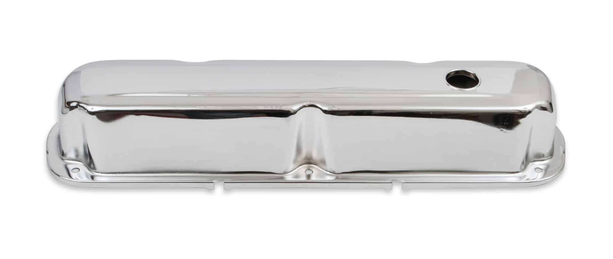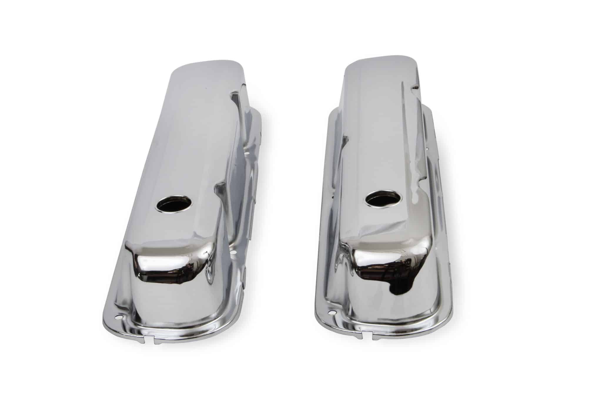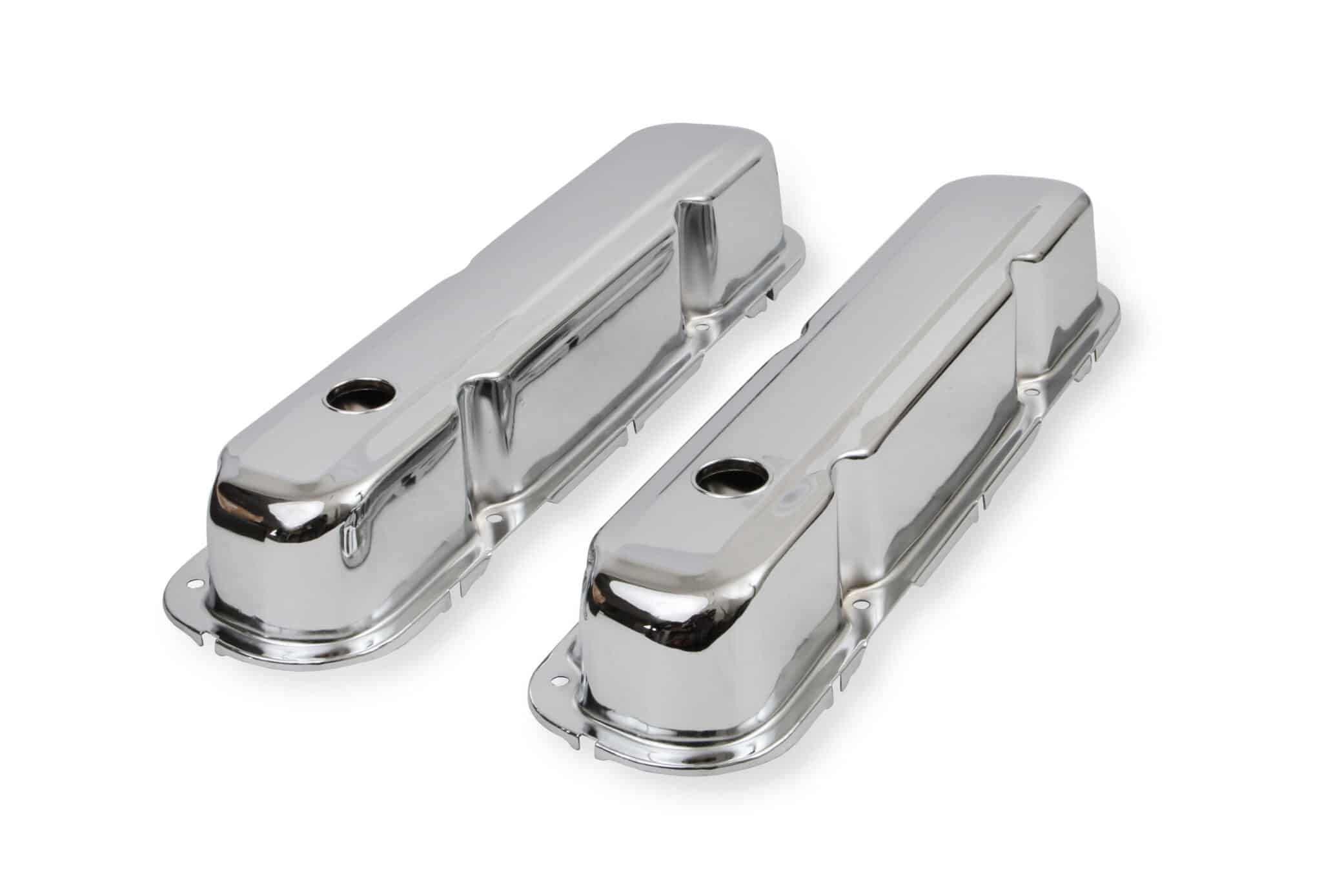 Chrome plated stamped steel valve covers have a flat smooth top, with internal baffles. Tall-style cover provides extra valve train clearance. Sold as a pair. Will not fit Magnum style heads.