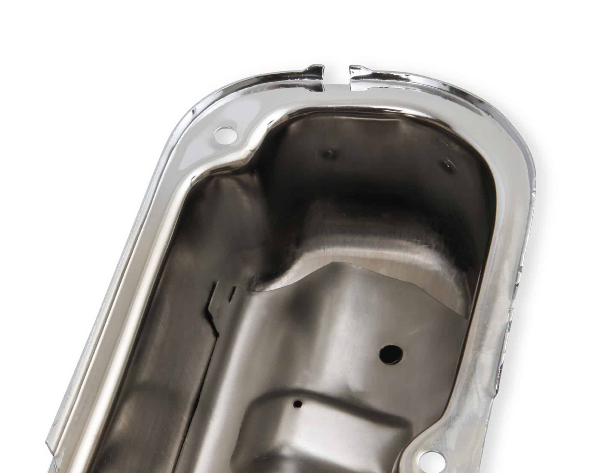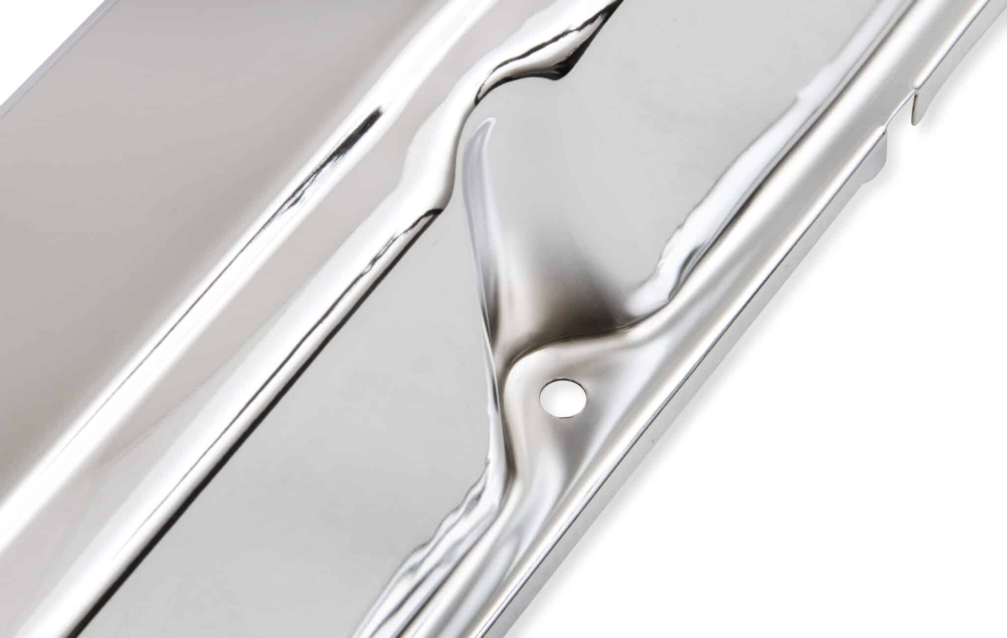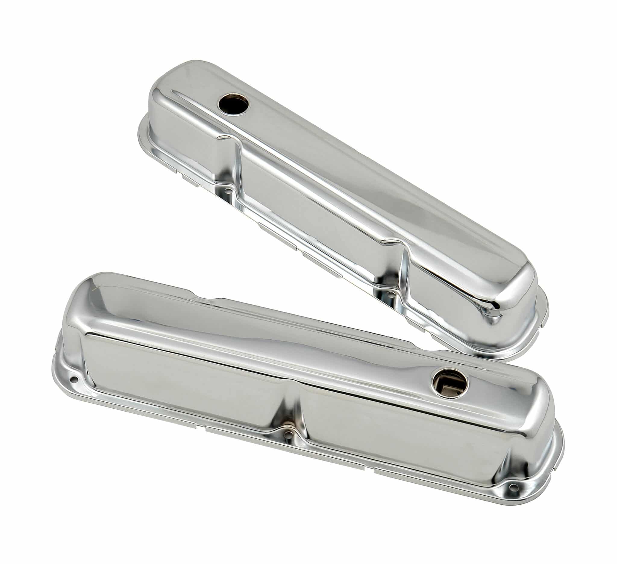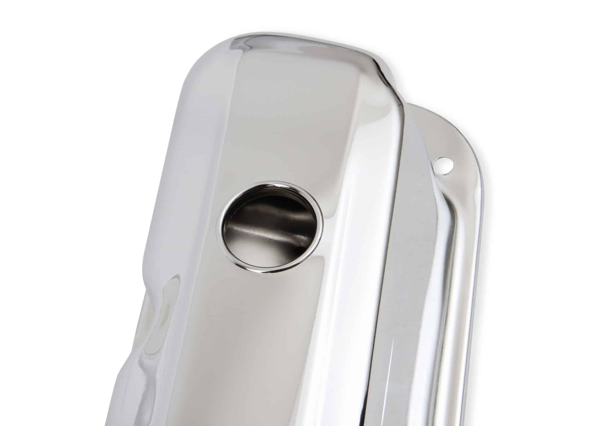 Chrome plated stamped steel valve covers have a flat smooth top, with internal baffles. Tall-style cover provides extra valve train clearance. Sold as a pair. Will not fit Magnum style heads.