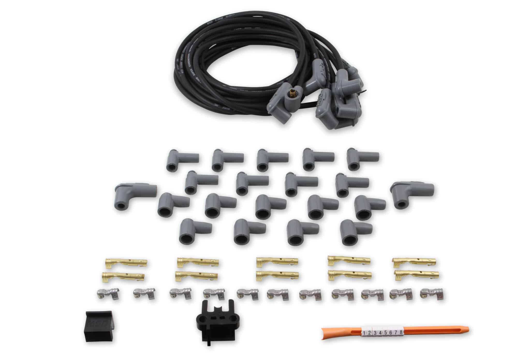 Our Universal spark plug wire sets come with the spark plug terminal and boot installed with the other end open. Distributor cap boots and terminals are included so you can cut the wire to the desired length, then install the terminal with the supplied Mini-Stripper-Crimper. It’s a little more work, but in the end it will be worth it.