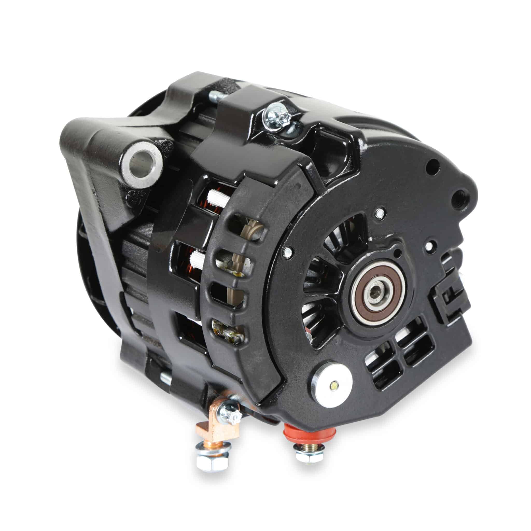 Whether you need a high output alternator to power your muscle car, street rod or touring machine, MSD has you covered with the DynaForce Alternator. For the street, MSD offers a 120 or 160 amp one-wire alternator. Not only are they designed for extreme output at higher rpm, but MSD balances the current output to keep your electronic components up to speed during idle and lower rpm operation as well. Both the 120 and 160 Amp alternators feature one-wire installation to keep things clean, easy and effective. The charge post of the alternators is moved to the side of the housing to allow for improved clearance to the block, plus a pulley baffle is included to ensure there is never any fan-to-belt issues (common at high rpm on lesser alternators).