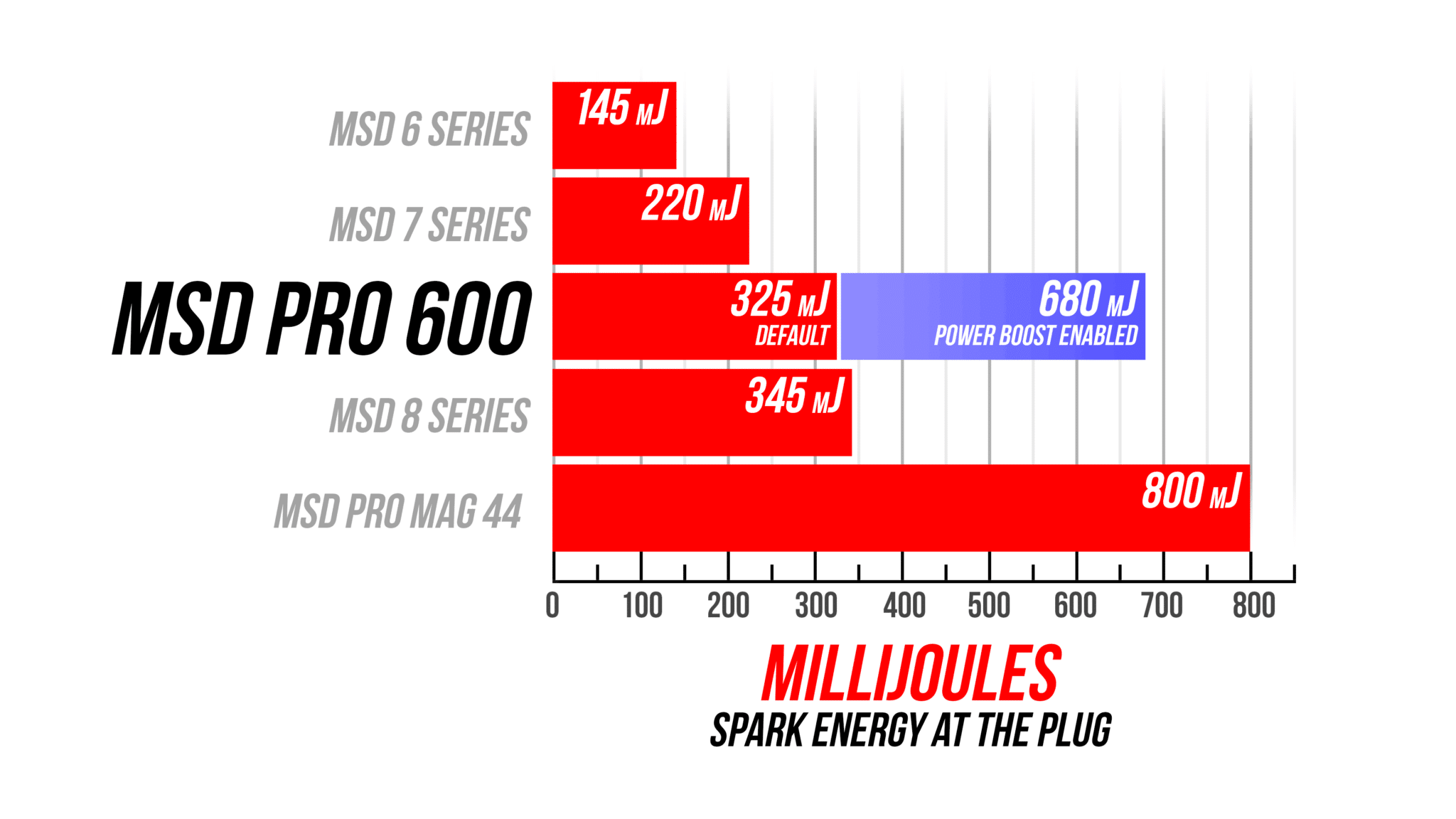 This ignition is capable of running continuously at an energy level of up to 600 mJ inducing more than 250 microseconds of spark duration. With a Power Boost wire, the ignition output can be changed on the fly between programmable lower energy (325 mJ by default) to its maximum energy output of 600 mJ.