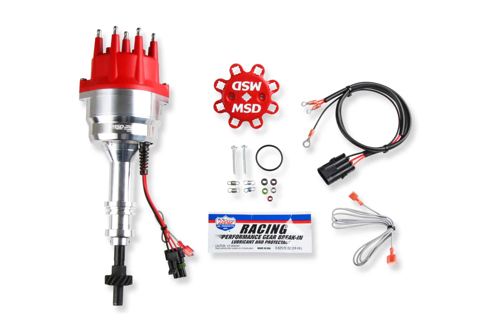 MSD’s Marine Pro-Billet Distributor with Small Diameter Red Cap and Ready to Run w/Steel Gear, No Ignition Box needed.